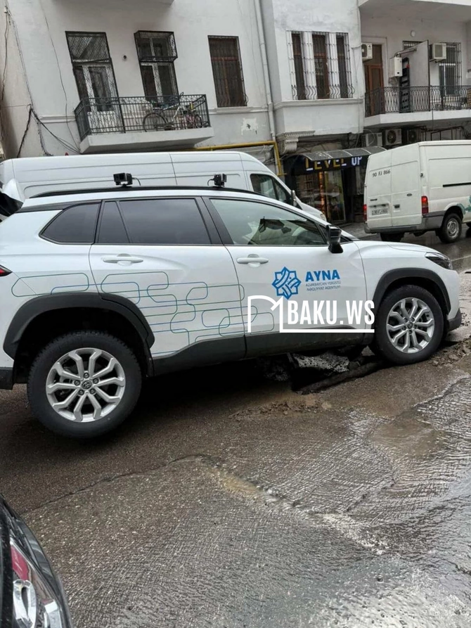 Azadlıq prospektində yolun asfalt qatı çöküb və AYNA-nın maşını həmin çuxura düşüb.