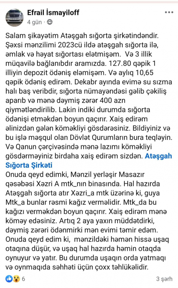 Şikayətim “Atəşgah” sığorta şirkətindəndir. Şəxsi mənzilimi 2023-cü ildə “Atəşgah Sığorta” ilə əmlak və həyat sığortası elətdirmişəm. İndi evimdə hadisə baş verib, ancaq sığorta şirkəti dəymiş zərəri qarşılamaqdan imtina edir”.Tribunainfo.az xəbər verir ki, bu barədə sosial şəbəkələrdə şikayətçi Əfrai İsmayılov yazıb. O bildirib ki, sığorta irkəti problemi mənzilin yerləşdiyi MTK-nın üstünə atır:“Sığorta şirkəti ilə 3 illik müqavilə bağlamışam. 127.80 qəpik 1 illik depozit ödənişi etmişəm. Aylıq 10,65 qəpik ödəniş edirəm. Dekabr ayında evimə su sızma halı baş verib, sığorta nümayəndəsi gəlib çəkiliş aparıb və mənə dəymiş zərər 400 manat qiymətləndirilib. Lakin şirkət sığorta ödənişi etməkdən boyun qaçırır.
