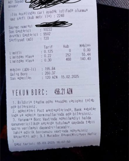 “Sonuncu dəfə 2024-cü il noyabrın 24-də qaza olan borcumu ödəmişəm – 61 manat. 2025-ci il yanvarın 1 də limitlə əlaqəli sayğacın sıfırlanması gözlənilirdi. Amma Xəzər rayon qaz idarəsi fevralən 1-i gəlib sayğaca baxış keçirib və qəbz də təqdim etməyib. Məlum olub ki, fevralın 1-nə qədər mən limiti keçmiş olmuşam (baxmayaraq yanvarın 1-də sıfırlanmalıydı sayğac) və 360 manat ödəməliyəm. Və fevralın 1-dən dediklərinə görə 2025-ci ilin hesabatı aparılacaq. Yəni 1200 kub limit hesablanacaq. Heç nə demədik. Fevral üçün sərfiyyat 720 kub olduğu halda və mən qanunsuz limiti keçmiş hesab olundum, sərfiyyat 22 qəpikdən hesablandı.