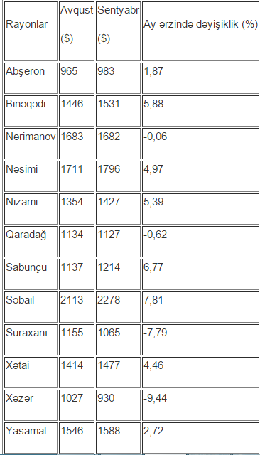 Bu ilin sentyabrında Bakının təkrar mənzil bazarında bir kvadratmetr sahənin orta qiyməti avqust ayı ilə müqayisədə 4,45 faiz artaraq 1618 dollar (manatla ifadədə isə 4,47 faiz artımla 1696 manatadək) təşkil edib.