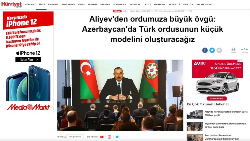 Türkiyənin “Anadolu”, İHA, “Sputnik Türkiye” xəbər agentliklərində, “Haberler” portalında, “TRT Haber”, “Haber Türk”, “CNN” “Haber Global”, “A Haber”, “NTV” telekanallarında, “Yeni şafak”, “Hurriyet”, “Posta”, “Milliyet”, “Sabah” qəzetlərində yayılmış məlumatlar “Azərbaycan Prezidenti Əliyev: Azərbaycanda türk Ordusunun kiçik modelini quracağıq”, “Əliyevdən Ordumuza böyük qiymət: Azərbaycanda türk ordusunun kiçik modelini quracağıq”, “Azərbaycan Prezidenti Əliyevdən Ermənistandakı hərbi çevriliş cəhdi haqqında açıqlama”, “Azərbaycan Prezidenti İlham Əliyev: Türk Ordusu bizim üçün ən məqbul modeldir”, “Ərdoğan və Əliyevdən Ermənistana mesaj”, “Azərbaycan Prezidenti Əliyevdən mühüm açıqlamalar” və s. sərlövhələrlə təqdim edilib.